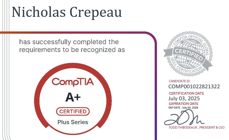 | Software | Visual Studio • Eclipse • VirtualBox • Blender • PrusaSlicer • Photoshop • Dreamweaver • MS Office • Windows • Linux (Arch & Debian/Ubuntu) |